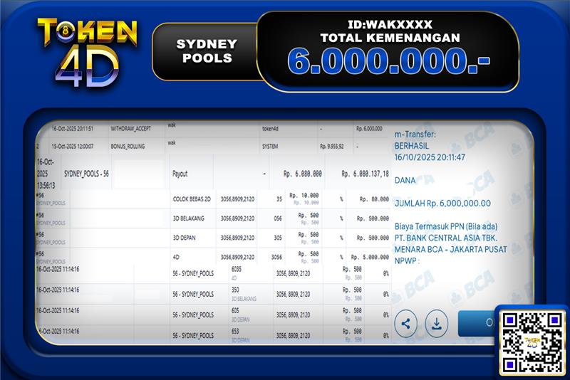 TOGEL SYDNEY POOLS – BUKTI JACKPOT SLOT TOKEN4D Selamat kepada member setia yang berhasil mendapatkan kemenangan fantastis di token4d. Kemenangan member dengan ID : WAKXXX pada permainan TOGEL SYDNEY POOLS…