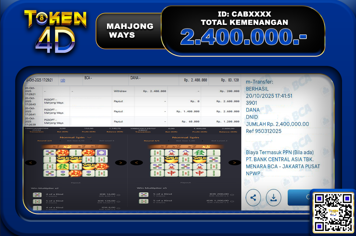 TOKEN4D JACKPOT MAHJONG WAYS – BUKTI JACKPOT SLOT TOKEN4D Selamat kepada member setia yang berhasil mendapatkan kemenangan fantastis di token4d. Kemenangan member dengan ID : CABXXX pada permainan PG SOFT…